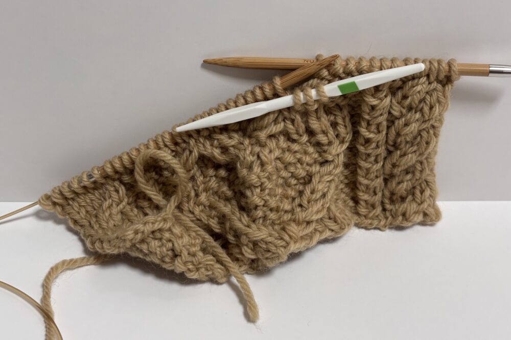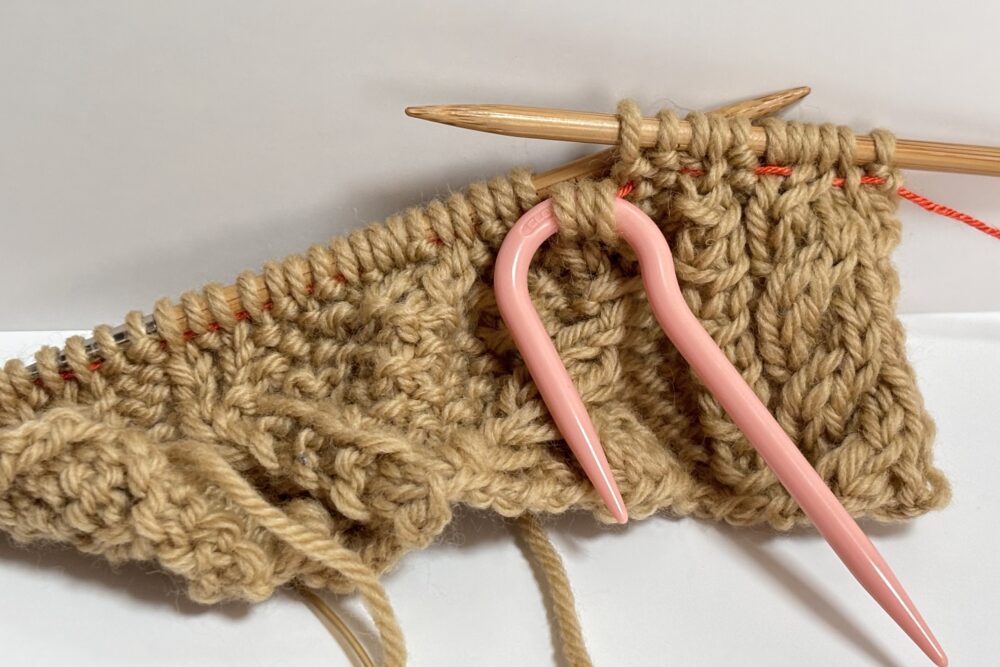 - なわ編み針に移して休ませていると編む手にあたって邪魔に感じることがある。