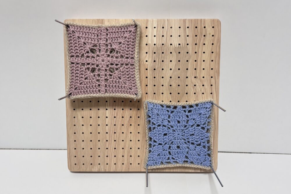 モチーフの数が多ければ多いほど、一つ一つピン打ちしてアイロンをかけるのは大変。ブロッキングボードを使うことでかなりの時短になりました。